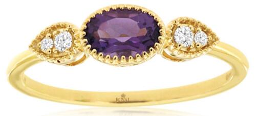 14KT YELLOW GOLD FUN RING. 3D FILIGREE DOUBLE LEAF DESIGN. ROUND DIAMONDS ARE F/G COLOR, VSSI CLARITY .05 CARATS. AAA EXTRA FACETED OVAL AMETHYST IS .40 CARATS. RING SIZE 7. CAN BE SIZED BY OUR MASTER JEWELER UPON REQUEST. WRITTEN APPRAISAL AVAILABLE. COMES IN A PRESENTABLE GIFT BOX.
