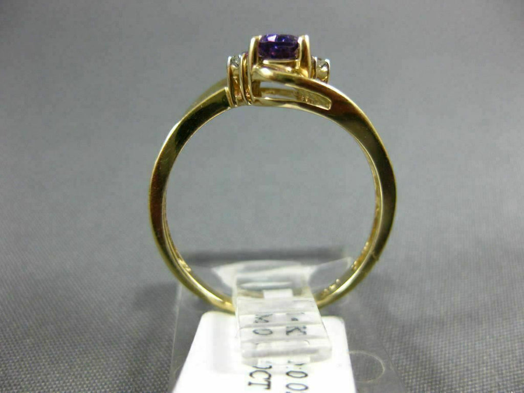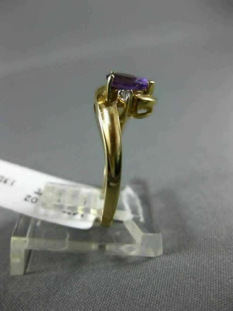 14KT YELLOW GOLD PROMISE RING. 3D THREE STONE DESIGN. DIAMONDS ARE F/G COLOR, VSSI CLARITY .02 CARATS. AAA AMETHYST IS .50 CARATS. MEASURES 8mm WIDE. RING SIZE 6.25. CAN BE SIZED BY OUR MASTER JEWELER UPON REQUEST. WRITTEN APPRAISAL AVAILABLE. COMES IN A PRESENTABLE GIFT BOX