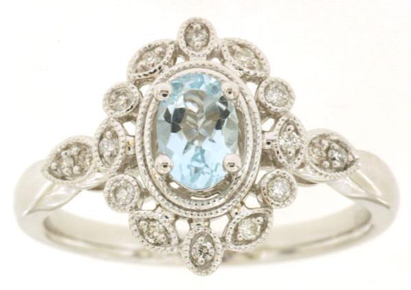 14KT WHITE GOLD FRIENDSHIP LOVE RING. 3D FILIGREE FLOWER DESIGN. ROUND DIAMONDS ARE F/G COLOR, VSSI CLARITY .13 CARATS. AAA EXTRA FACETED OVAL AQUAMARINE IS .42 CARATS. RING SIZE 7. CAN BE SIZED BY OUR MASTER JEWELER UPON REQUEST. WRITTEN APPRAISAL AVAILABLE. COMES IN A PRESENTABLE GIFT BOX.