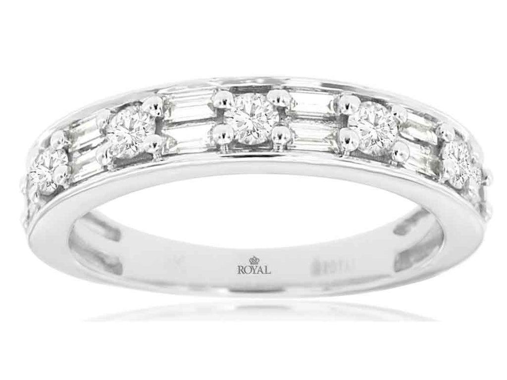 14KT WHITE GOLD WEDDING ANNIVERSARY RING. 3D CLASSIC TWO ROW DESIGN. ROUND AND BAGUETTE DIAMONDS ARE F/G COLOR, VSSI CLARITY .57 CARATS. RING SIZE 7. CAN BE SIZED BY OUR MASTER JEWELER UPON REQUEST. WRITTEN APPRAISAL AVAILABLE. COMES IN A PRESENTABLE GIFT BOX.