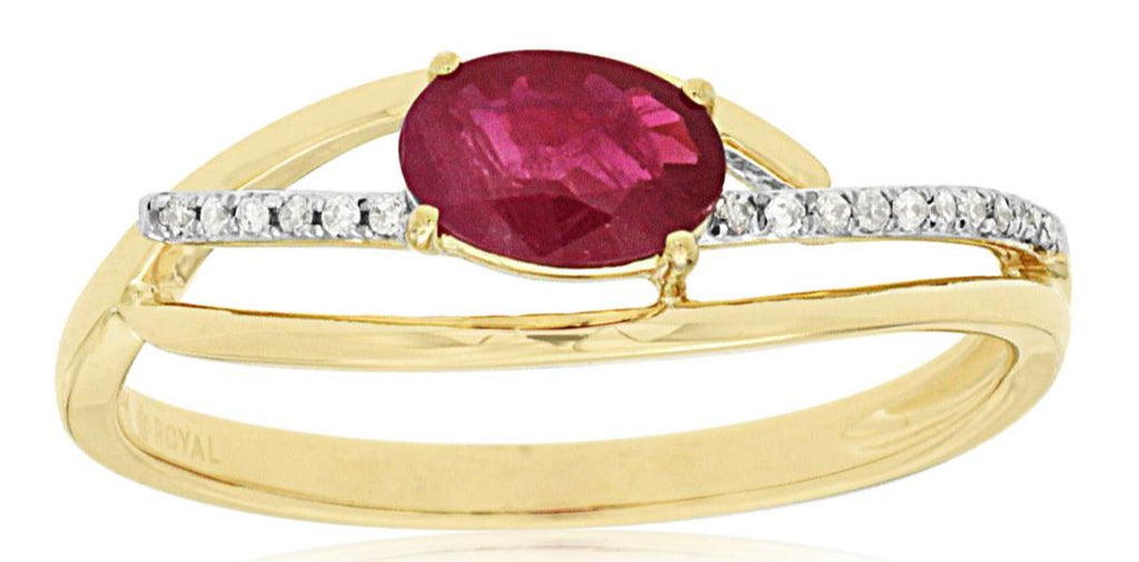 14KT YELLOW GOLD LOVE RING. 3D CRISS CROSS DESIGN. ROUND DIAMONDS ARE F/G COLOR, VSSI CLARITY .05 CARATS. AAA OVAL RUBY IS .55 CARATS. RING SIZE 7. CAN BE SIZED BY OUR MASTER JEWELER UPON REQUEST. WRITTEN APPRAISAL AVAILABLE. COMES IN A PRESENTABLE GIFT BOX.