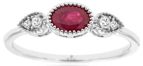 14KT WHITE GOLD LOVE RING. 3D FIVE STONE FLORAL DESIGN. ROUND DIAMONDS ARE F/G COLOR, VSSI CLARITY .05 CARATS. AAA OVAL RUBY IS .60 CARATS. RING SIZE 7. CAN BE SIZED BY OUR MASTER JEWELER UPON REQUEST.