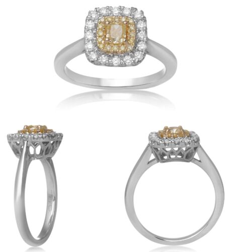 18KT WHITE AND YELLOW GOLD ENGAGEMENT RING. 3D SQUARE HALO DESIGN. ROUND WHITE DIAMONDS ARE F/G COLOR, VS CLARITY .30 CARATS. ROUND FANCY YELLOW DIAMONDS ARE .10 CARATS. CUSHION CUT FANCY YELLOW DIAMOND IS .28 CARATS. RING SIZE 6.5. CAN BE SIZED BY OUR MASTER JEWELER UPON REQUEST. WRITTEN APPRAISAL AVAILABLE. COMES IN A PRESENTABLE GIFT BOX.