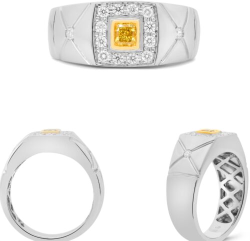 14KT WHITE AND YELLOW GOLD MENS RING. 3D CLASSIC SQUARE BEZEL ETOILE DESIGN. WHITE DIAMONDS ARE F/G COLOR, VS CLARITY. ROUND WHITE DIAMONDS ARE .33 CARATS. CUSHION CUT FANCY YELLOW DIAMOND IS .36 CARATS. RING SIZE 10. CAN BE SIZED BY OUR MASTER JEWELER UPON REQUEST. WRITTEN APPRAISAL AVAILABLE. COMES IN A PRESENTABLE GIFT BOX.