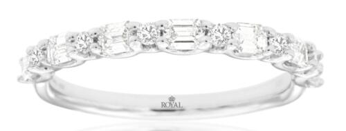 14KT WHITE GOLD WEDDING ANNIVERSARY RING. 3D SHARED PRONG SEMI ETERNITY DESIGN. ROUND AND BAGUETTE DIAMONDS ARE F/G COLOR, VSSI CLARITY .70 CARATS. RING SIZE 7. CAN BE SIZED BY OUR MASTER JEWELER UPON REQUEST.