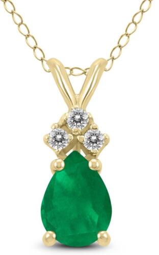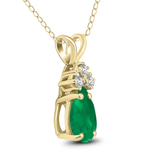 14KT YELLOW GOLD FLOATING PENDANT. 3D CLASSIC TEAR DROP DESIGN. ROUND DIAMONDS ARE G/H COLOR, SI CLARITY .03 CARATS. AAA PEAR SHAPE EMERALD IS .70 CARATS. COMES ON A 14KT GOLD DIAMOND CUT 18" INCH CHAIN. WRITTEN APPRAISAL AVAILABLE. COMES IN A PRESENTABLE GIFT BOX.