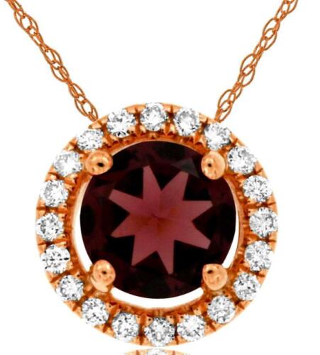 14KT ROSE GOLD FLOATING PENDANT. 3D CLASSIC HALO DESIGN. ROUND DIAMONDS ARE F/G COLOR, VSSI CLARITY .08 CARATS. AAA EXTRA FACETED ROUND RHODOLITE IS .65 CARATS. COMES ON A 14KT GOLD DIAMOND CUT 16" INCH CHAIN.