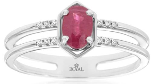 14KT WHITE GOLD FREINDSHIP LOVE RING. 3D ROUND OCTAGON DOUBLE BAND DESIGN. DIAMONDS ARE F/G COLOR, VSSI CLARITY .04 CARATS. GEM IS .70 CARATS. FEATURES AAA RUBY OVAL. RING SIZE 7. CAN BE SIZED BY OUR MASTER JEWELER UPON REQUEST. WRITTEN APPRAISAL AVAILABLE. COMES IN A PRESENTABLE GIFT BOX.