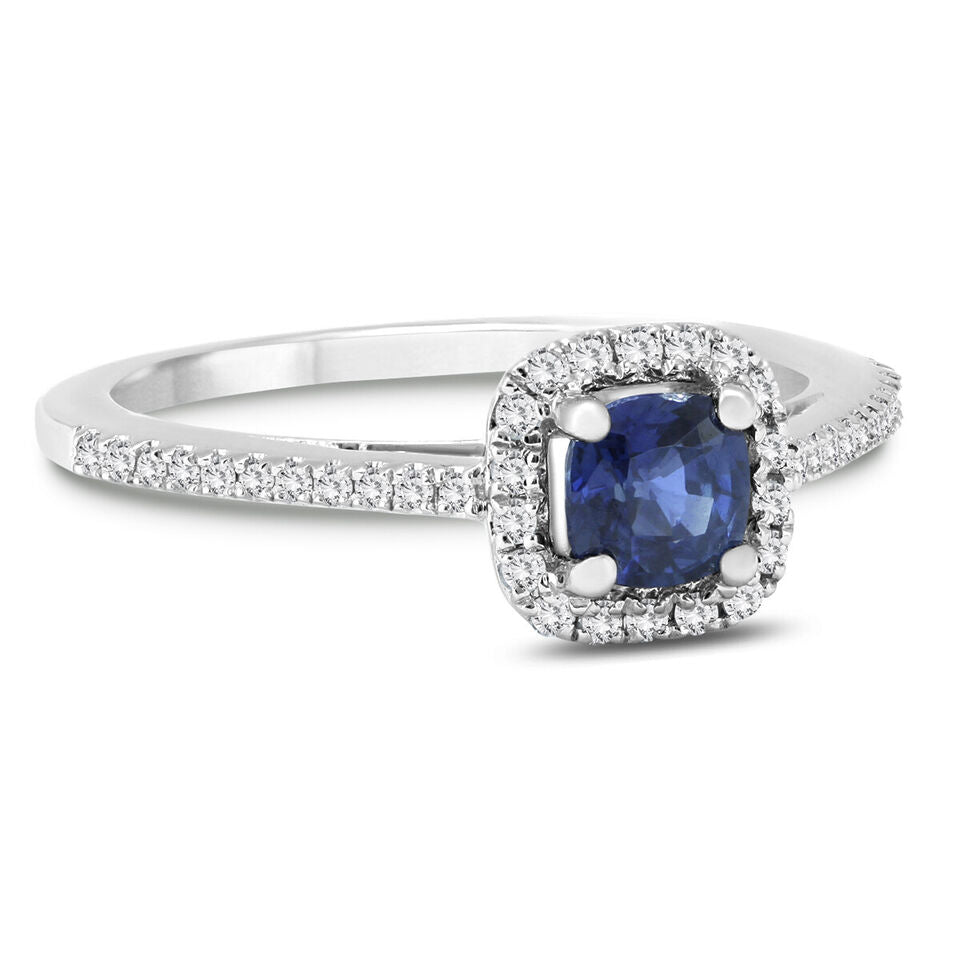 14KT WHITE GOLD ENGAGEMENT RING. 3D SQUARE HALO DESIGN. ROUND DIAMONDS ARE G/H COLOR, SI CLARITY .25 CARATS. AAA CUSHION CUT SAPPHIRE IS .50 CARATS. RING SIZE 6.5. CAN BE SIZED BY OUR MASTER JEWELER UPON REQUEST. WRITTEN APPRAISAL AVAILABLE. COMES IN A PRESENTABLE GIFT BOX.SERIOUS OFFERS CONSIDERED#IT-PRR57861SP-5.0