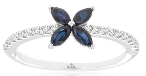 14KT WHITE GOLD FRIENDSHIP LOVE RING. 3D FLOWER DESIGN. ROUND DIAMONDS ARE F/G COLOR, VSSI CLARITY .20 CARATS. AAA MARQUISE SHAPE SAPPHIRES ARE .55 CARATS. RING SIZE 7. CAN BE SIZED BY OUR MASTER JEWELER UPON REQUEST.