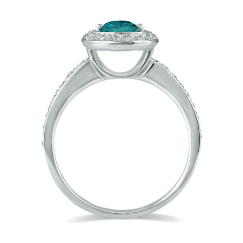 14KT WHITE GOLD ENGAGEMENT RING. 3D CLASSIC HALO DESIGN. WHITE DIAMONDS ARE G/H COLOR, SI CLARITY. WHITE AND BLUE DIAMONDS ARE .75 CARATS. RING SIZE 6.5. CAN BE SIZED BY OUR MASTER JEWELER UPON REQUEST.