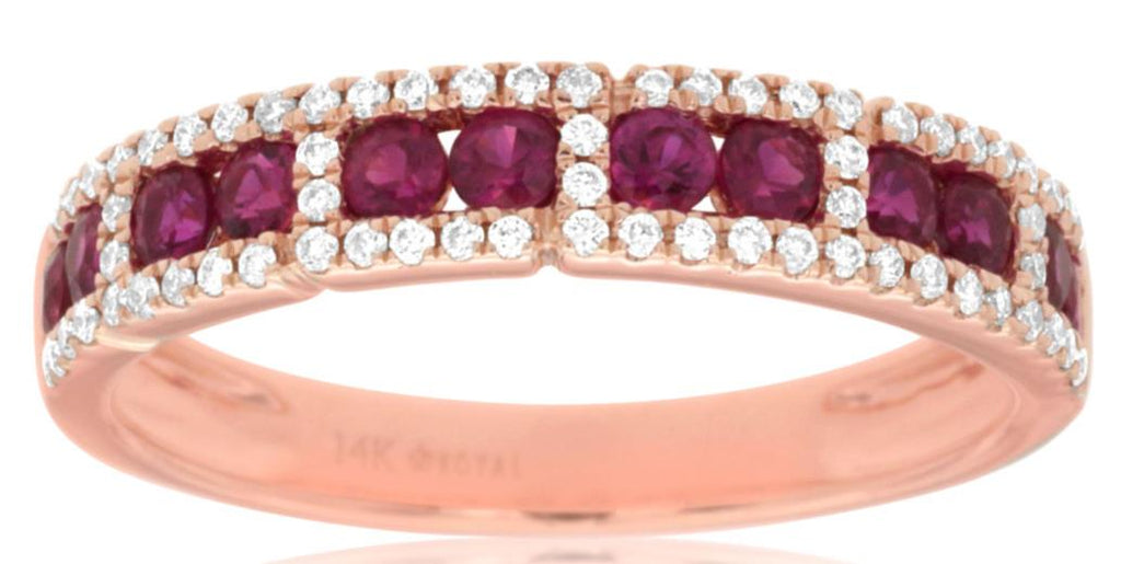 14KT ROSE GOLD WEDDING ANNIVERSARY RING. 3D SQUARE DESIGN. DIAMONDS ARE F/G COLOR, VSSI CLARITY .20 CARATS. AAA ROUND RUBIES ARE .60 CARATS. RING SIZE 7. CAN BE SIZED BY OUR MASTER JEWELER UPON REQUEST. WRITTEN APPRAISAL AVAILABLE. COMES IN A PRESENTABLE GIFT BOX.