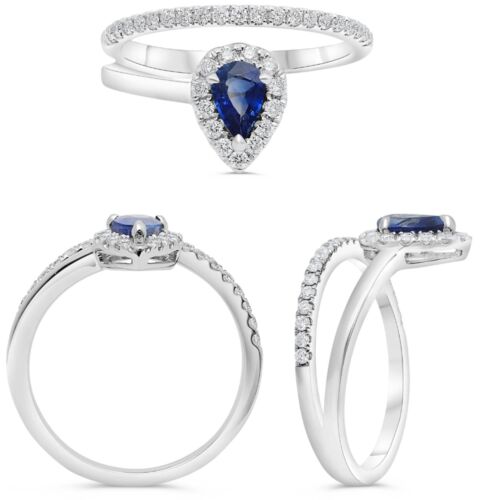 14KT WHITE GOLD FUN RING. 3D HALO DOUBLE BAND DESIGN. ROUND DIAMONDS ARE F/G COLOR, VS CLARITY .30 CARATS. AAA PEAR SHAPE SAPPHIRE IS .50 CARATS. RING SIZE 6.5. CAN BE SIZED BY OUR MASTER JEWELER UPON REQUEST.