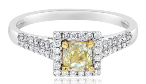 14KT YELLOW AND WHITE GOLD ENGAGEMENT RING. 3D CLASSIC SQAURE HALO DESIGN. ROUND WHITE DIAMONDS ARE F/G COLOR, VSSI CLARITY. CUSHION CUT FANCY YELLOW DIAMOND IS .51 CARATS. RING SIZE 7. CAN BE SIZED BY OUR MASTER JEWELER UPON REQUEST. WRITTEN APPRAISAL AVAILABLE. COMES IN A PRESENTABLE GIFT BOX.