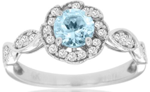 14KT WHITE GOLD FRIENDSHIP LOVE RING. 3D HALO FLORAL DESIGN. ROUND DIAMONDS ARE F/G COLOR, VSSI CLARITY .27 CARATS. AAA EXTRA FACETED ROUND AQUAMARINE IS .55 CARATS. RING SIZE 7. CAN BE SIZED BY OUR MASTER JEWELER UPON REQUEST. WRITTEN APPRAISAL AVAILABLE. COMES IN A PRESENTABLE GIFT BOX.