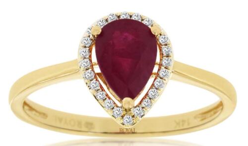 14KT YELLOW GOLD FRIENDSHIP LOVE RING. 3D CLASSIC HALO DESIGN. ROUND DIAMONDS ARE F/G COLOR, VSSI CLARITY .08 CARATS. AAA PEAR SHAPE RUBY IS .75 CARATS. RING SIZE 7. CAN BE SIZED BY OUR MASTER JEWELER UPON REQUEST.
