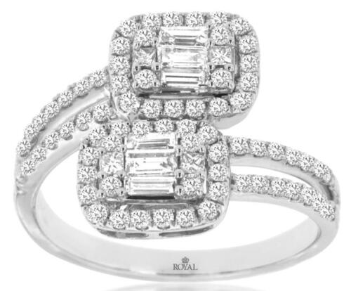 14KT WHITE GOLD LOVE RING. 3D DOUBLE SQUARE CRISS CROSS DESIGN. ROUND BAGUETTE AND PRINCESS CUT DIAMONDS ARE F/G COLOR, VSSI CLARITY .86 CARATS. RING SIZE 7. CAN BE SIZED BY OUR MASTER JEWELER UPON REQUEST. WRITTEN APPRAISAL AVAILABLE. COMES IN A PRESENTABLE GIFT BOX.