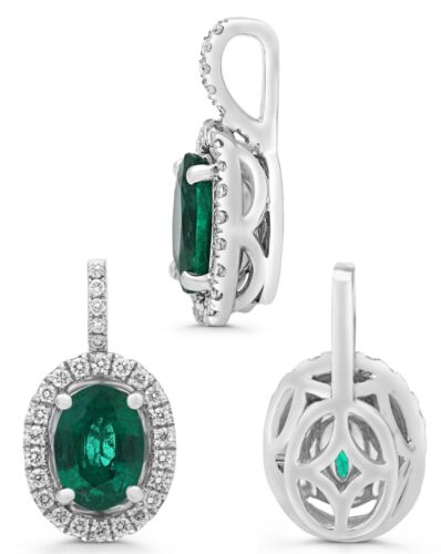 14KT WHITE GOLD FLOATING PENDANT. 3D FILIGREE HALO DESIGN. ROUND DIAMONDS ARE F/G COLOR, VS CLARITY .11 CARATS. AAA OVAL EMERALD IS .75 CARATS. COMES ON A 14KT GOLD DIAMOND CUT 16" INCH CHAIN. WRITTEN APPRAISAL AVAILABLE. COMES IN A PRESENTABLE GIFT BOX.