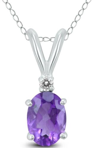 14KT WHITE GOLD FLOATING PENDANT. 3D CLASSIC SOLITAIRE DESIGN. ROUND DIAMONDS ARE G/H COLOR, SI CLARITY .03 CARATS. AAA EXTRA FACETED OVAL AMETHYST IS .85 CARATS. COMES ON A 14KT GOLD DIAMOND CUT 18" INCH CHAIN.