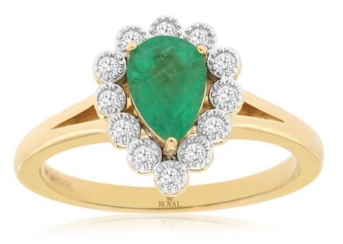 14KT YELLOW GOLD FUN RING. 3D FILIGREE HALO DESIGN. ROUND DIAMONDS ARE F/G COLOR, VSSI CLARITY .14 CARATS. AAA PEAR SHAPE EMERALD IS .75 CARATS. RING SIZE 7. CAN BE SIZED BY OUR MASTER JEWELER UPON REQUEST. WRITTEN APPRAISAL AVAILABLE. COMES IN A PRESENTABLE GIFT BOX.