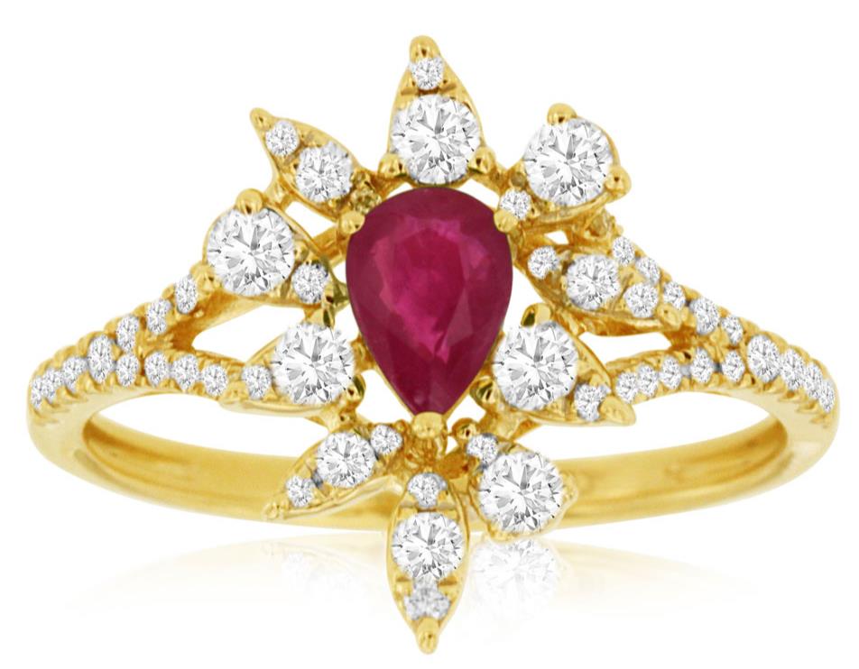 0.90CT DIAMOND & AAA RUBY 14KT YELLOW GOLD 3D PEAR SHAPE & ROUND FLOWER LOVE RING
