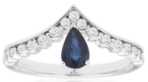 14KT WHITE GOLD RING. 3D V SHAPE CROWN DESIGN. ROUND DIAMONDS ARE F/G COLOR, VSSI CLARITY .37 CARATS. AAA EXTRA FACETED PEAR SHAPE SAPPHIRE IS .53 CARATS. RING SIZE 7. CAN BE SIZED BY OUR MASTER JEWELER UPON REQUEST. WRITTEN APPRAISAL AVAILABLE. COMES IN A PRESENTABLE GIFT BOX.