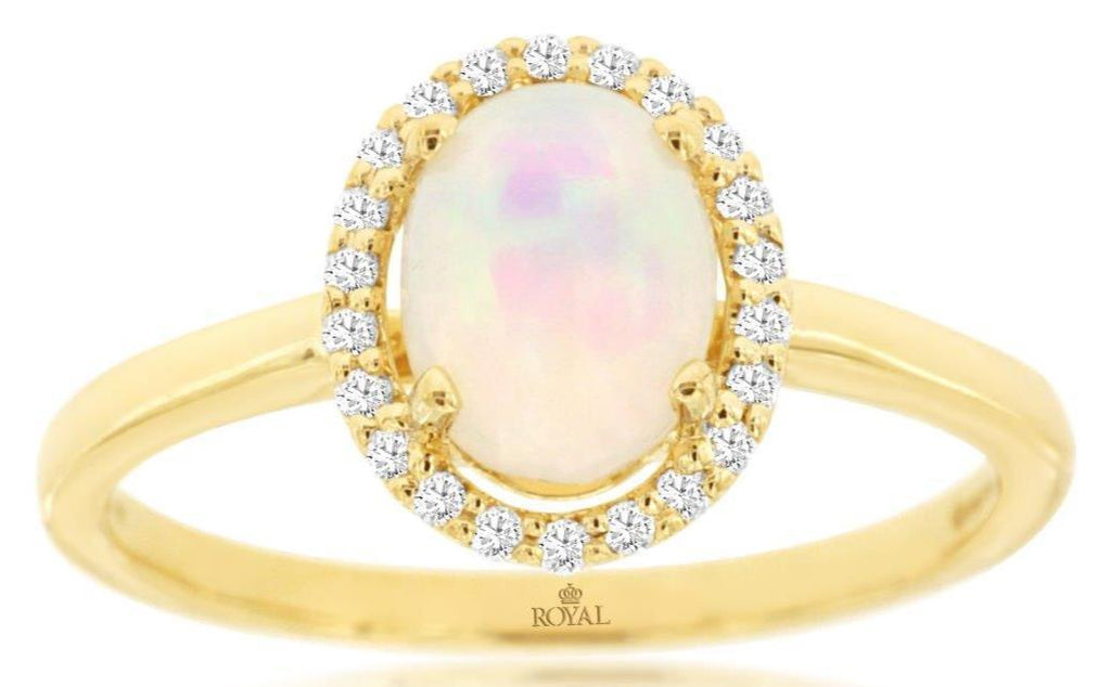 14KT YELLOW GOLD FUN RING. 3D CLASSIC HALO DESIGN. ROUND DIAMONDS ARE F/G COLOR, VSSI CLARITY .12 CARATS. AAA OVAL OPAL IS .80 CARATS. RING SIZE 7. CAN BE SIZED BY OUR MASTER JEWELER UPON REQUEST. WRITTEN APPRAISAL AVAILABLE. COMES IN A PRESENTABLE GIFT BOX.