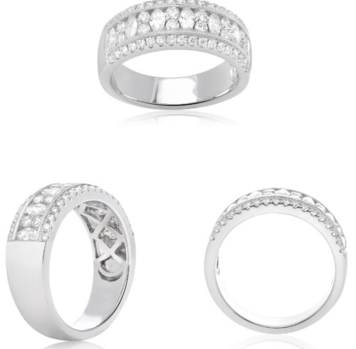 14KT WHITE GOLD WEDDING BAND ANNIVERSARY RING. 3D THREE ROW SEMI ETERNITY DESIGN. DIAMONDS ARE F/G COLOR, VS CLARITY. ROUND DIAMONDS ARE .59 CARATS. MARQUISE SHAPE DIAMONDS ARE .35 CARATS. RING SIZE 6.5. CAN BE SIZED BY OUR MASTER JEWELER UPON REQUEST. WRITTEN APPRAISAL AVAILABLE. COMES IN A PRESENTABLE GIFT BOX.