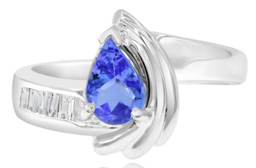 14KT WHITE GOLD LOVE RING. 3D CRISS CROSS DESIGN. BAGUETTE DIAMONDS ARE F/G COLOR, VSSI CLARITY .20 CARATS. AAA EXTRA FACETED PEAR SHAPE TANZANITE IS .75 CARATS. RING SIZE 7. CAN BE SIZED BY OUR MASTER JEWELER UPON REQUEST. WRITTEN APPRAISAL AVAILABLE. COMES IN A PRESENTABLE GIFT BOX.