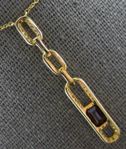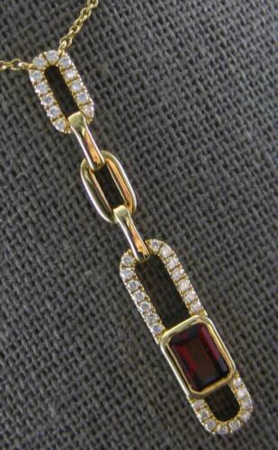 14KT YELLOW GOLD FUN LOVE NECKLACE. 3D OVAL LINK LARIAT DESIGN. ROUND DIAMONDS ARE F/G COLOR, VSSI CLARITY .17 CARATS. AAA EMERALD CUT GARNET IS .79 CARATS. MEASURES 37mm X 5.5mm. CAN BE WORN 15-18" INCHES LONG.