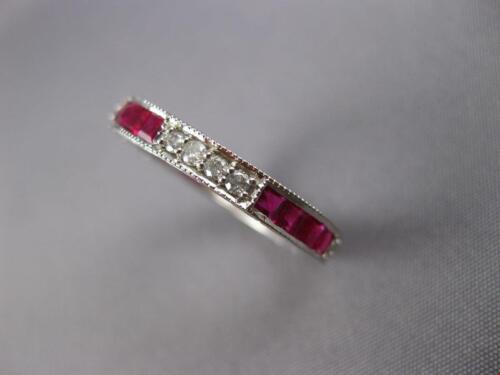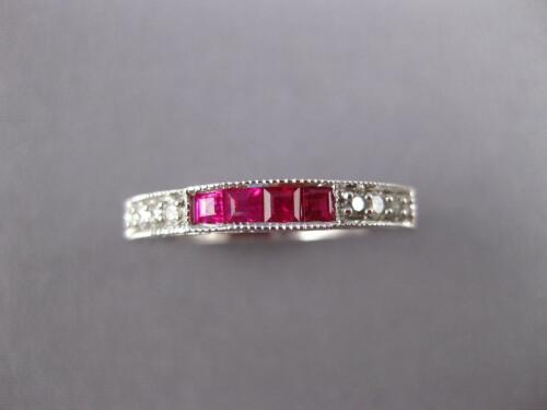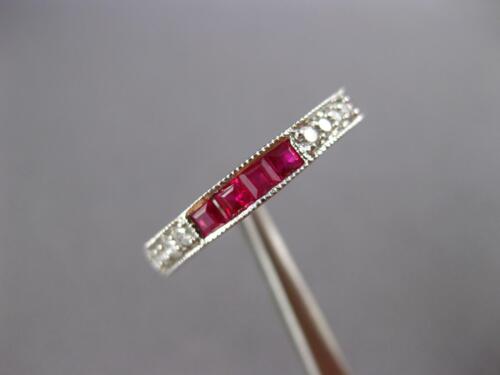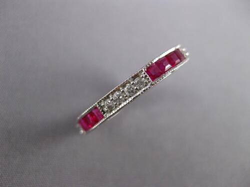 14KT WHITE GOLD ANNIVERSARY RING. 3D FILIGREE ETERNITY DESIGN. ROUND DIAMONDS ARE F/G COLOR, VVS-VS CLARITY .32 CARATS. AAA PRINCESS CUT RUBIES ARE .64 CARATS. MEASURES 3mm WIDE. RING SIZE 7. CAN BE SIZED BY OUR MASTER JEWELER UPON REQUEST. WRITTEN APPRAISAL AVAILABLE. COMES IN A PRESENTABLE GIFT BOX.