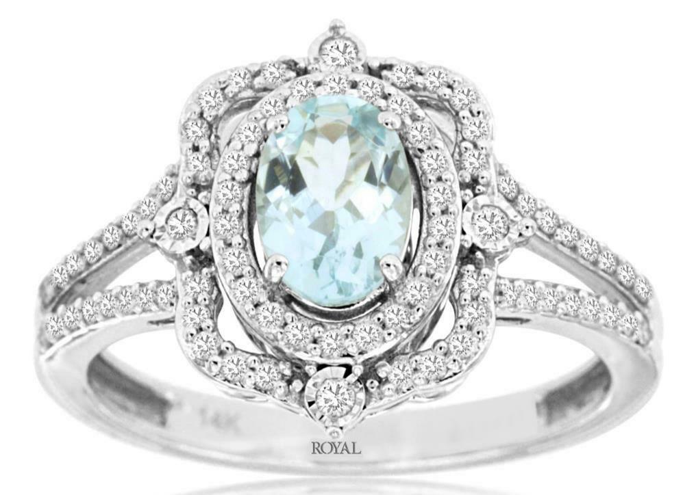 14KT WHITE GOLD RING. 3D FILIGREE SQUARE CROWN DESIGN. ROUND DIAMONDS ARE F/G COLOR, VSSI CLARITY .33 CARATS. AAA OVAL AQUAMARINE IS .68 CARATS. RING SIZE 7. CAN BE SIZED BY OUR MASTER JEWELER UPON REQUEST. WRITTEN APPRAISAL AVAILABLE. COMES IN A PRESENTABLE GIFT BOX.