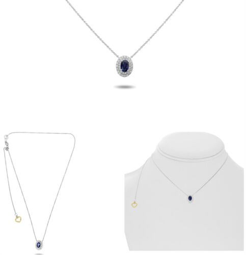 18KT WHITE GOLD LOVE NECKLACE. 3D DOUBLE HALO ADJUSTABLE DESIGN. ROUND DIAMONDS ARE F/G COLOR, VS CLARITY .23 CARATS. AAA OVAL SAPPHIRES ARE .78 CARATS. 16" INCHES LONG.