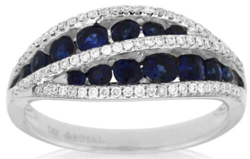 14KT WHITE GOLD FUN RING. 3D MULTI ROW DOUBLE LEAF DESIGN. ROUND DIAMONDS ARE F/G COLOR, VSSI CLARITY .22 CARATS. AAA EXTRA FACETED ROUND SAPPHIRES ARE .80 CARATS. RING SIZE 7. CAN BE SIZED BY OUR MASTER JEWELER UPON REQUEST. WRITTEN APPRAISAL AVAILABLE. COMES IN A PRESENTABLE GIFT BOX.