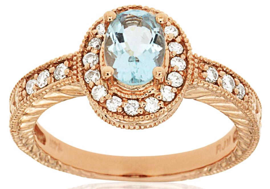 1.03CT DIAMOND & AAA AQUAMARINE 14KT ROSE GOLD 3D OVAL & ROUND ENGAGEMENT RING