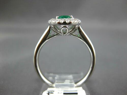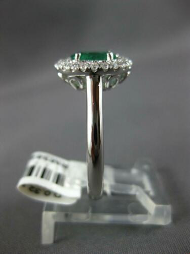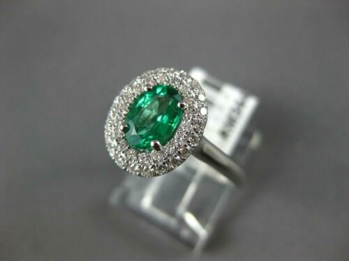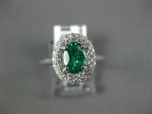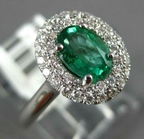 18KT WHITE GOLD ENGAGEMENT RING. 3D CLASSIC DOUBLE HALO DESIGN. ROUND DIAMONDS ARE F/G COLOR, VSSI CLARITY .32 CARATS. AAA OVAL EMERALD IS .71 CARATS. EMERALD MEASURES 6.5mm X 5mm. RING MEASURES 12mm WIDE. RING SIZE 7. CAN BE SIZED BY OUR MASTER JEWELER UPON REQUEST. WRITTEN APPRAISAL AVAILABLE. COMES IN A PRESENTABLE GIFT BOX.
