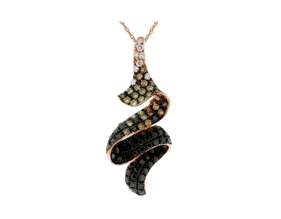 14KT BLACK AND ROSE GOLD FUN FLOATING PENDANT. 3D CRISS CROSS DOUBLE WAVE DESIGN. WHITE DIAMONDS ARE F/G COLOR, VSSI CLARITY .08 CARATS. BLACK AND CHOCOLATE FANCY DIAMONDS ARE .95 CARATS. COMES ON A 14KT GOLD DIAMOND CUT 18" INCH CHAIN. WRITTEN APPRAISAL AVAILABLE. COMES IN A PRESENTABLE GIFT BOX.
