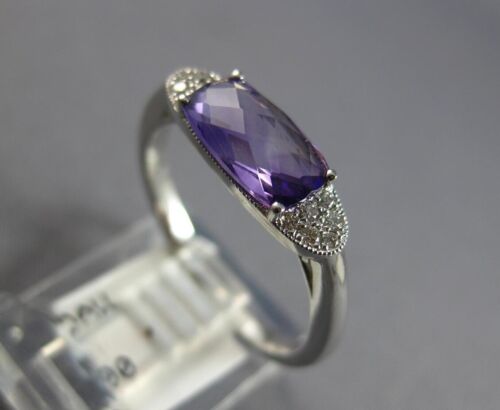 14KT WHITE GOLD FUN RING. 3D SEMI MOON DESIGN. ROUND DIAMONDS ARE F/G COLOR, VSSI CLARITY .08 CARATS. AAA EXTRA FACETED CUSHION CUT AMETHYST IS .96 CARATS. MEASURES 5mm WIDE. RING SIZE 7. CAN BE SIZED BY OUR MASTER JEWELER UPON REQUEST. WRITTEN APPRAISAL AVAILABLE. COMES IN A PRESENTABLE GIFT BOX.