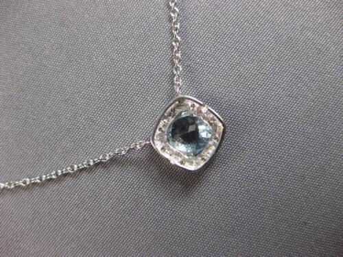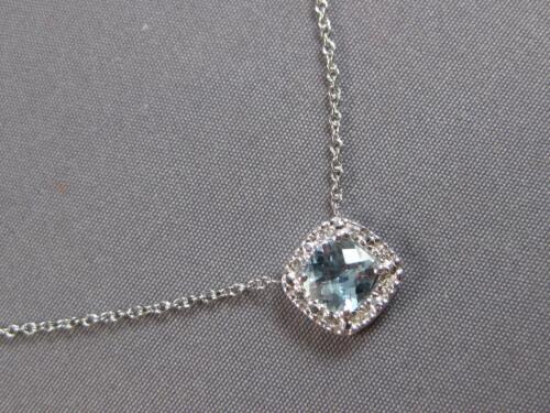 14KT WHITE GOLD LOVE NECKLACE. 3D SQUARE HALO DESIGN. ROUND DIAMONDS ARE F/G COLOR, VSSI CLARITY .04 CARATS. AAA EXTRA FACETED CUSHION CUT AQUAMARINE IS 1.0 CARAT. MEASURES 9mm WIDE. 18" INCHES LONG. WRITTEN APPRAISAL AVAILABLE. COMES IN A PRESENTABLE GIFT BOX.