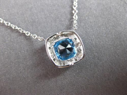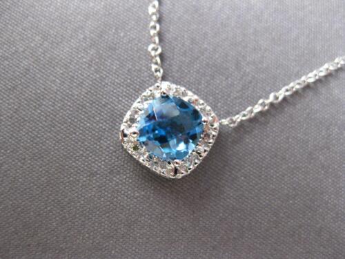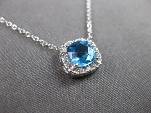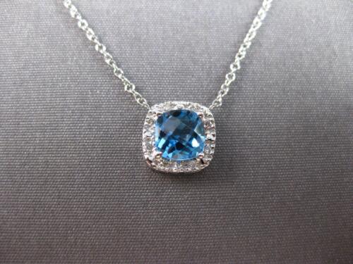 14KT WHITE GOLD LOVE NECKLACE. 3D CLASSIC SQUARE HALO DESIGN. ROUND DIAMONDS ARE F/G COLOR, VSSI CLARITY .04 CARATS. AAA EXTRA FACETED CUSHION CUT BLUE TOPAZ IS 1.0 CARAT. MEASURES 9mm WIDE. 18" INCHES LONG. WRITTEN APPRAISAL AVAILABLE. COMES IN A PRESENTABLE GIFT BOX.