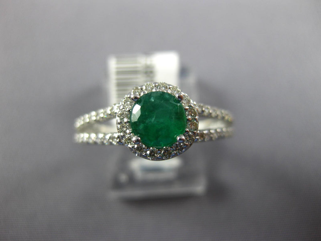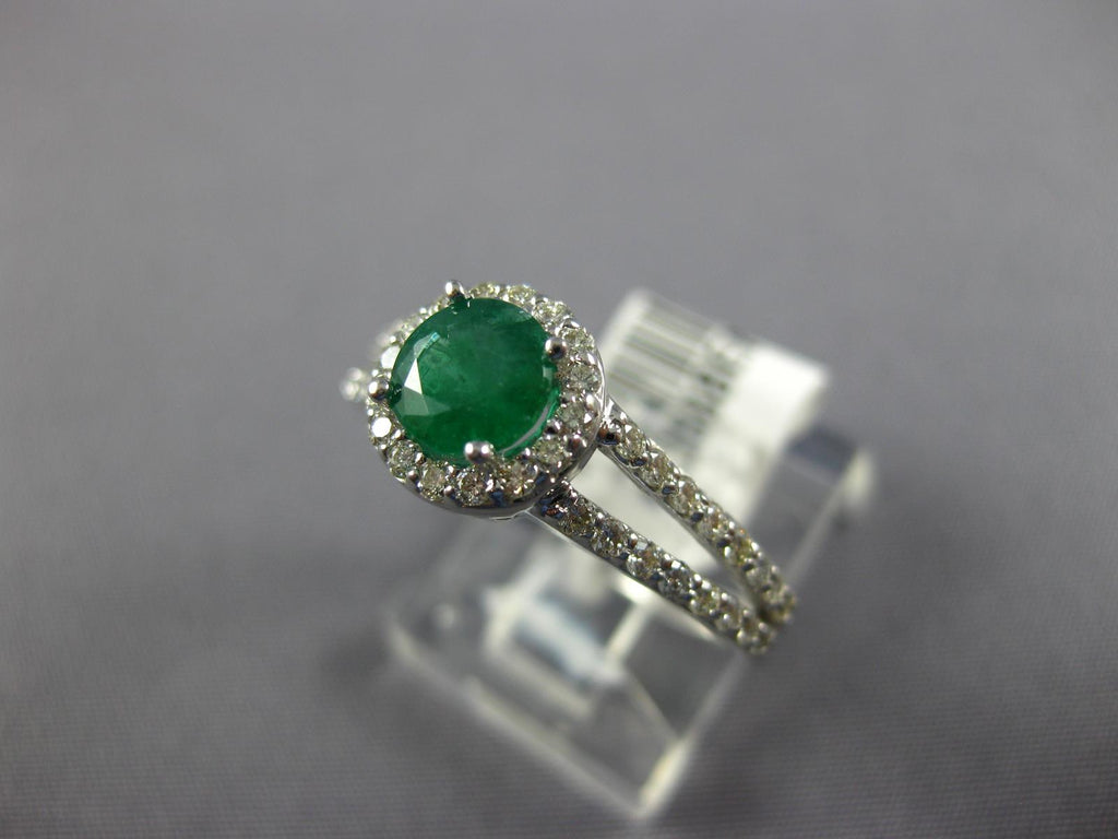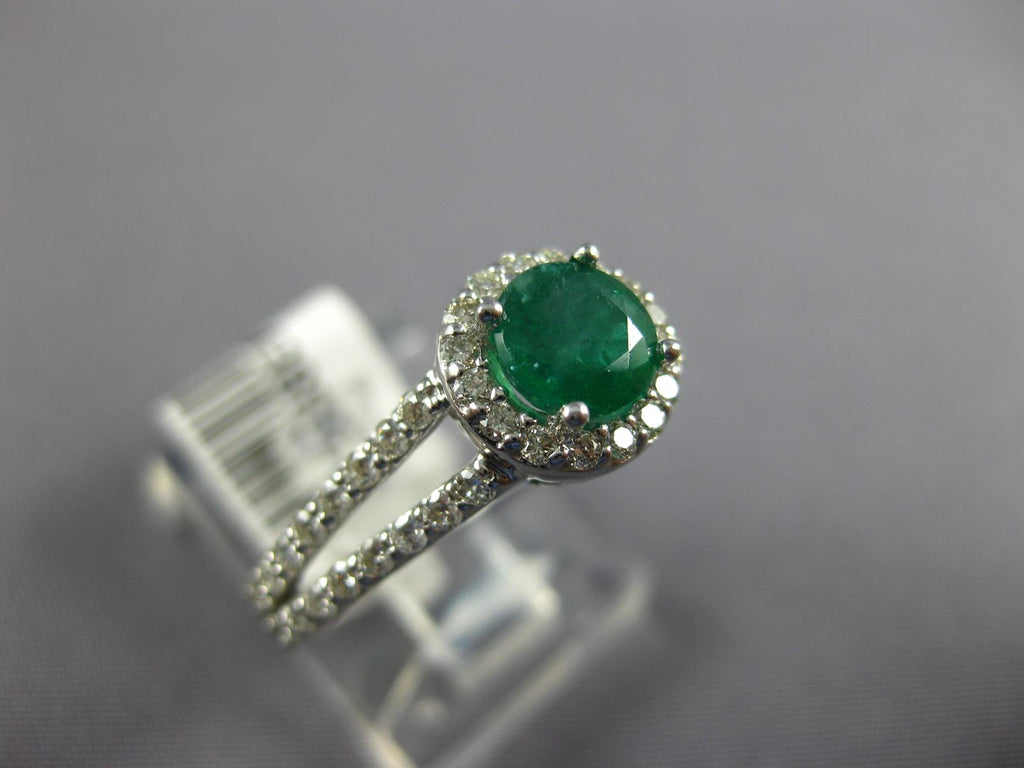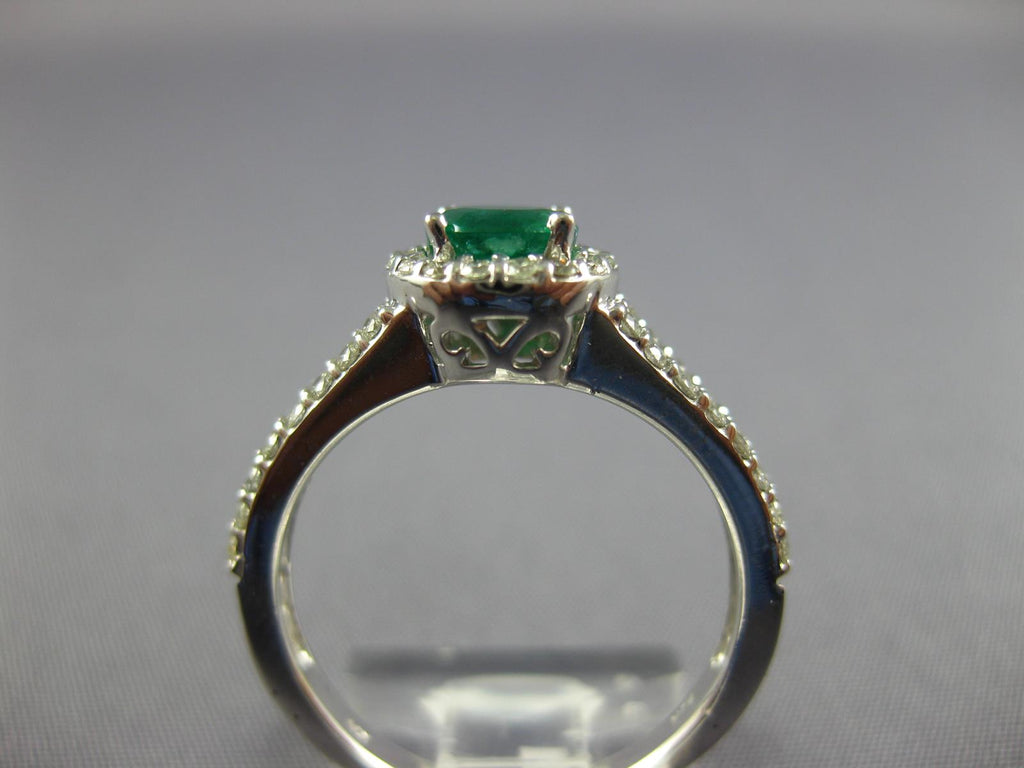 14KT WHITE GOLD ENGAGEMENT RING. 3D CLASSIC HALO DESIGN. DIAMONDS ARE F/G COLOR, VSSI CLARITY .48 CARATS. AAA ROUND EMERALD IS .56 CARATS. MEASURES 8mm WIDE. RING SIZE 7. CAN BE SIZED BY OUR MASTER JEWELER UPON REQUEST. WRITTEN APPRAISAL AVAILABLE. COMES IN A PRESENTABLE GIFT BOX.