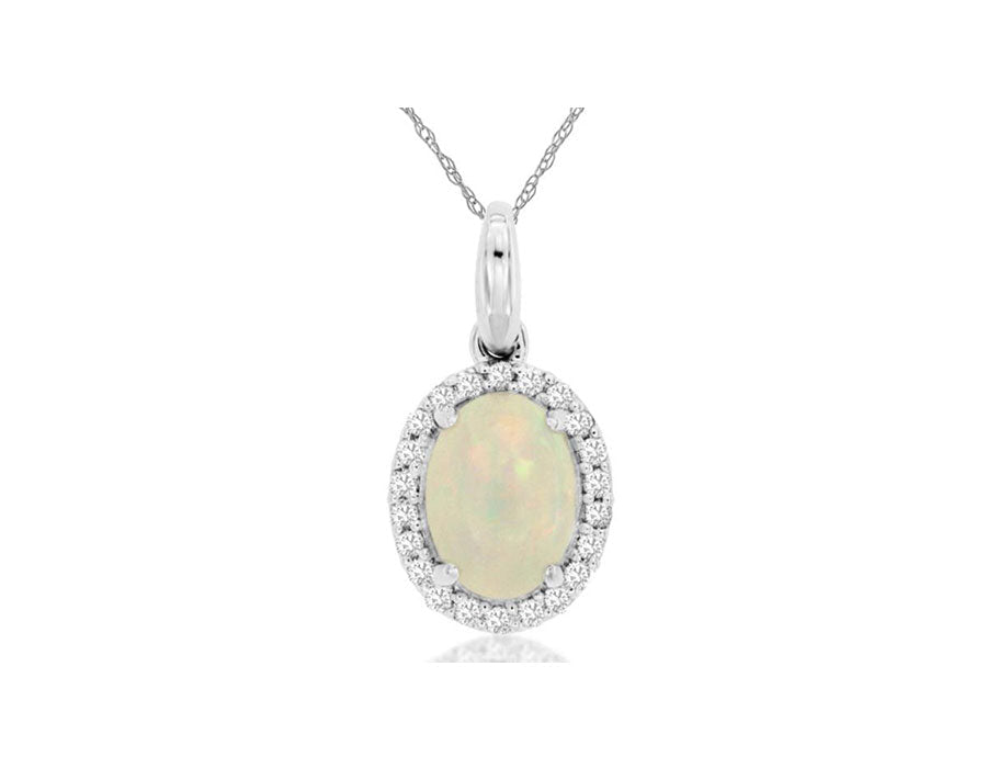 14KT WHITE GOLD FLOATING PENDANT. 3D CLASSIC HALO DESIGN. ROUND DIAMONDS ARE F/G COLOR, VSSI CLARITY .14 CARATS. AAA OVAL OPAL IS .90 CARATS. COMES ON A 14KT GOLD DIAMOND CUT 18" INCH CHAIN. WRITTEN APPRAISAL AVAILABLE. COMES IN A PRESENTABLE GIFT BOX.