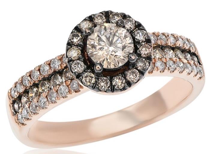 14KT ROSE GOLD ENGAGEMENT RING. 3D CLASSIC HALODESIGN. WHITE DIAMONDS ARE F/G COLOR, VSSI CLARITY .27 CARATS. CHOCOLATE FANCY DIAMONDS ARE .77 CARATS.RING SIZE 7. CAN BE SIZED BY OUR MASTER JEWELER UPON REQUEST. WRITTEN APPRAISAL AVAILABLE. COMES IN A PRESENTABLE GIFT BOX.