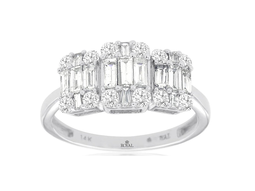 14KT WHITE GOLD FUN RING. 3D CLUSTER PAST PRESENT FUTURE DESIGN. ROUND AND BAGUETTE DIAMONDS ARE F/G COLOR, VSSI CLARITY 1.05 CARATS. RING SIZE 7. CAN BE SIZED BY OUR MASTER JEWELER UPON REQUEST. WRITTEN APPRAISAL AVAILABLE. COMES IN A PRESENTABLE GIFT BOX.