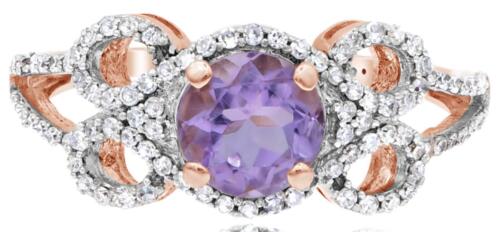 14KT ROSE GOLD FRIENDSHIP LOVE RING. 3D DOUBLE INFINITY DESIGN. ROUND DIAMONDS ARE F/G COLOR, VSSI CLARITY .30 CARATS. AAA EXTRA FACETED ROUND AMETHYST IS .75 CARATS. RING SIZE 7. CAN BE SIZED BY OUR MASTER JEWELER UPON REQUEST.