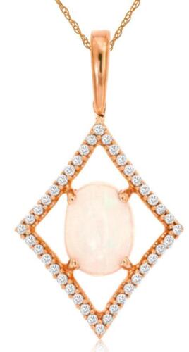 14KT ROSE GOLD FUN FLOATING PENDANT. 3D GEOMETRICAL TEAR DROP DESIGN. ROUND DIAMONDS ARE F/G COLOR, VSSI CLARITY .15 CARATS. AAA OVAL OPAL IS .90 CARATS. COMES ON A 14KT GOLD DIAMOND CUT 18" INCH CHAIN. WRITTEN APPRAISAL AVAILABLE. COMES IN A PRESENTABLE GIFT BOX.