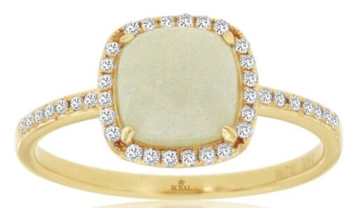 14KT YELLOW GOLD LOVE RING. 3D SQUARE HALO DESIGN. ROUND DIAMONDS ARE F/G COLOR, VSSI CLARITY .15 CARATS. AAA CUSHION CUT OPAL IS .90 CARATS. RING SIZE 7. CAN BE SIZED BY OUR MASTER JEWELER UPON REQUEST. WRITTEN APPRAISAL AVAILABLE. COMES IN A PRESENTABLE GIFT BOX.
