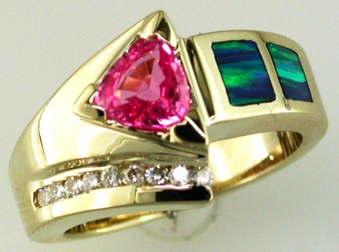 14KT YELLOW GOLD FUN RING. 3D DESIGN. ROUND DIAMONDS ARE F/G COLOR, VSSI CLARITY .15 CARATS. AAA TRILLION CUT PINK SAPPHIRE IS .90 CARATS. FEATURES AAA OPAL. RING SIZE 7. CAN BE SIZED BY OUR MASTER JEWELER UPON REQUEST. WRITTEN APPRAISAL AVAILABLE. COMES IN A PRESENTABLE GIFT BOX.