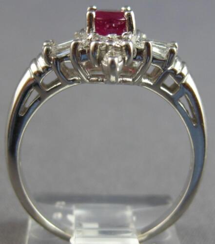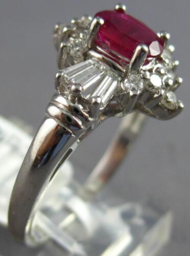 14KT WHITE GOLD ENGAGEMENT RING. 3D FLORAL DESIGN. ROUND AND BAGUETTE DIAMONDS ARE F/G COLOR, VSSI CLARITY .55 CARATS. AAA OVAL RUBY IS .50 CARATS. AAA RUBY MEASURES 6mm X 4.5mm WIDE. RING MEASURES 13MM WIDE. RING SIZE 6.25. CAN BE SIZED BY OUR MASTER JEWELER UPON REQUEST. WRITTEN APPRAISAL AVAILABLE. COMES IN A PRESENTABLE GIFT BOX.