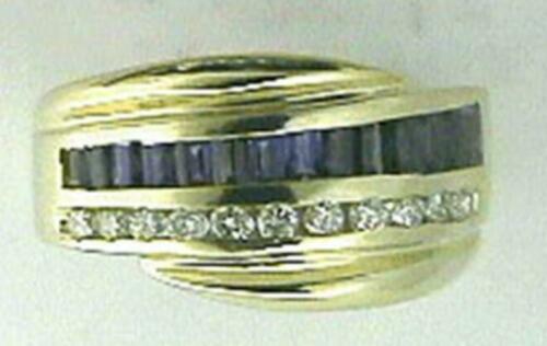 14KT YELLOW GOLD ANNIVERSARY RING. 3D CHANNEL DESIGN. ROUND DIAMONDS ARE F/G COLOR, VSSI CLARITY .25 CARATS. AAA BAGUETTE SAPPHIRES ARE .80 CARATS. RING SIZE 7. CAN BE SIZED BY OUR MASTER JEWELER UPON REQUEST. WRITTEN APPRAISAL AVAILABLE. COMES IN A PRESENTABLE GIFT BOX.
